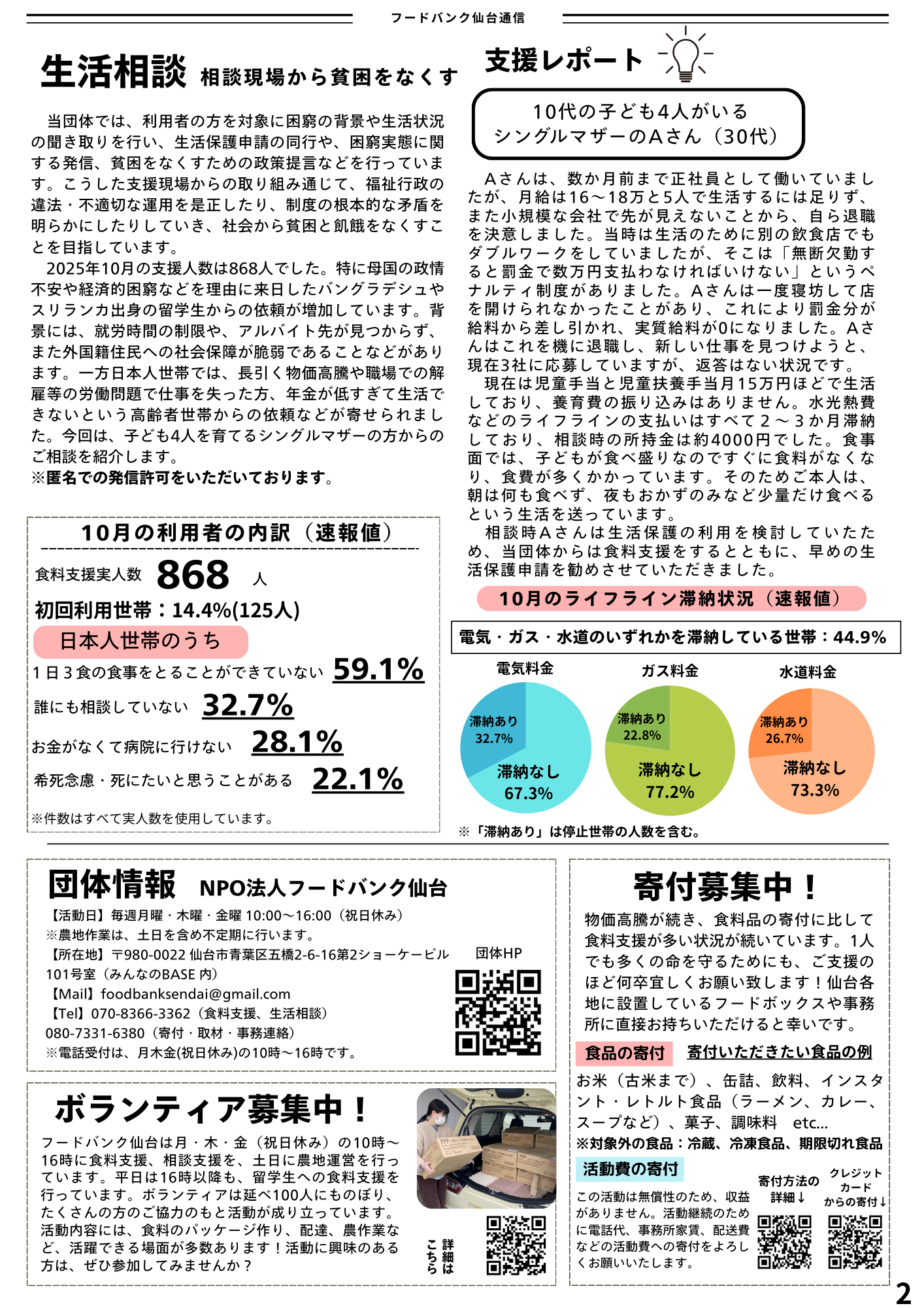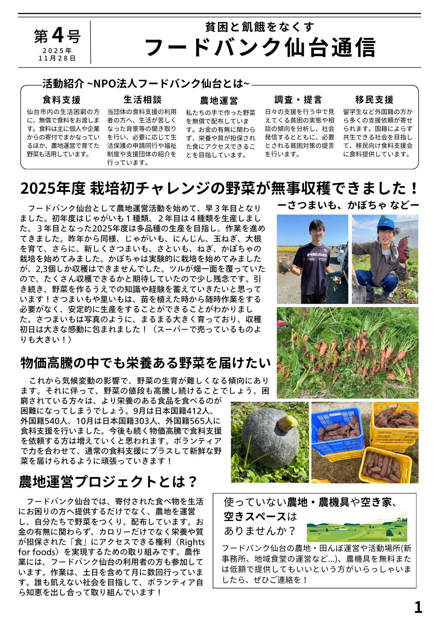 メディア掲載情報や、支援現場からの報告、農地の報告など、フードバンク仙台の活動をより知ることができる内容になっております。ぜひご覧ください!
