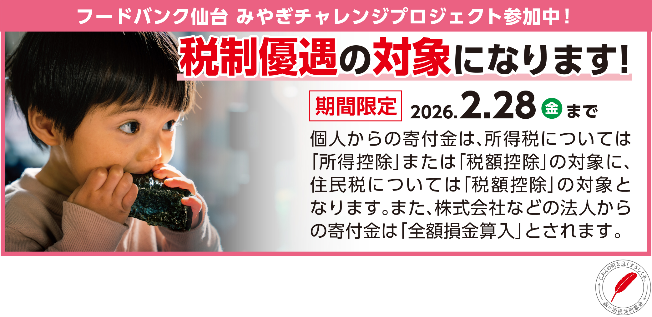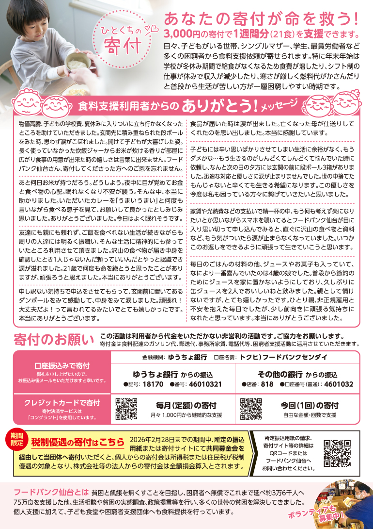 このプロジェクトは、2025年12月1日(月)から2026年2月28日(土)までの期間中に、所定の振込用紙、または下記URLからのインターネット決済(クレジットカード等)にて、宮城県共同募金会を経由して当団体へご寄付いただくことで、個人からの寄付金は、所得税については「所得控除」または「税額控除」の対象に、住民税については「税額控除」の対象となります。また、株式会社などの法人からの寄付金は「全額損金算入」とされます。