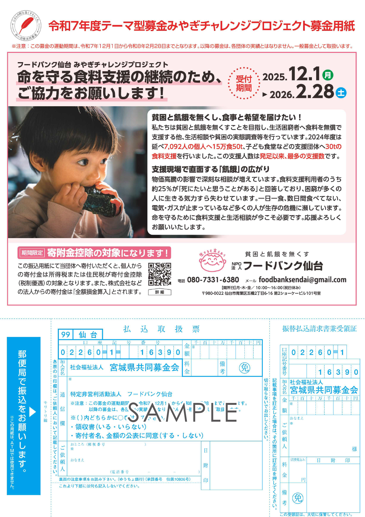 このたびフードバンク仙台は、社会福祉法人 宮城県共同募金会が主催する「令和7年度テーマ型募金みやぎチャレンジプロジェクト」に採択され参加することとなりました。